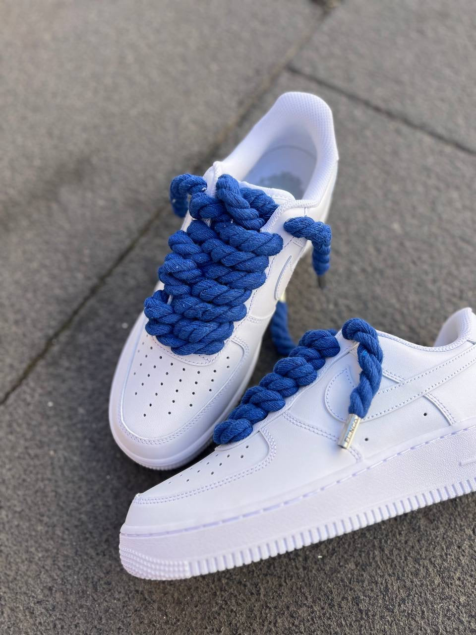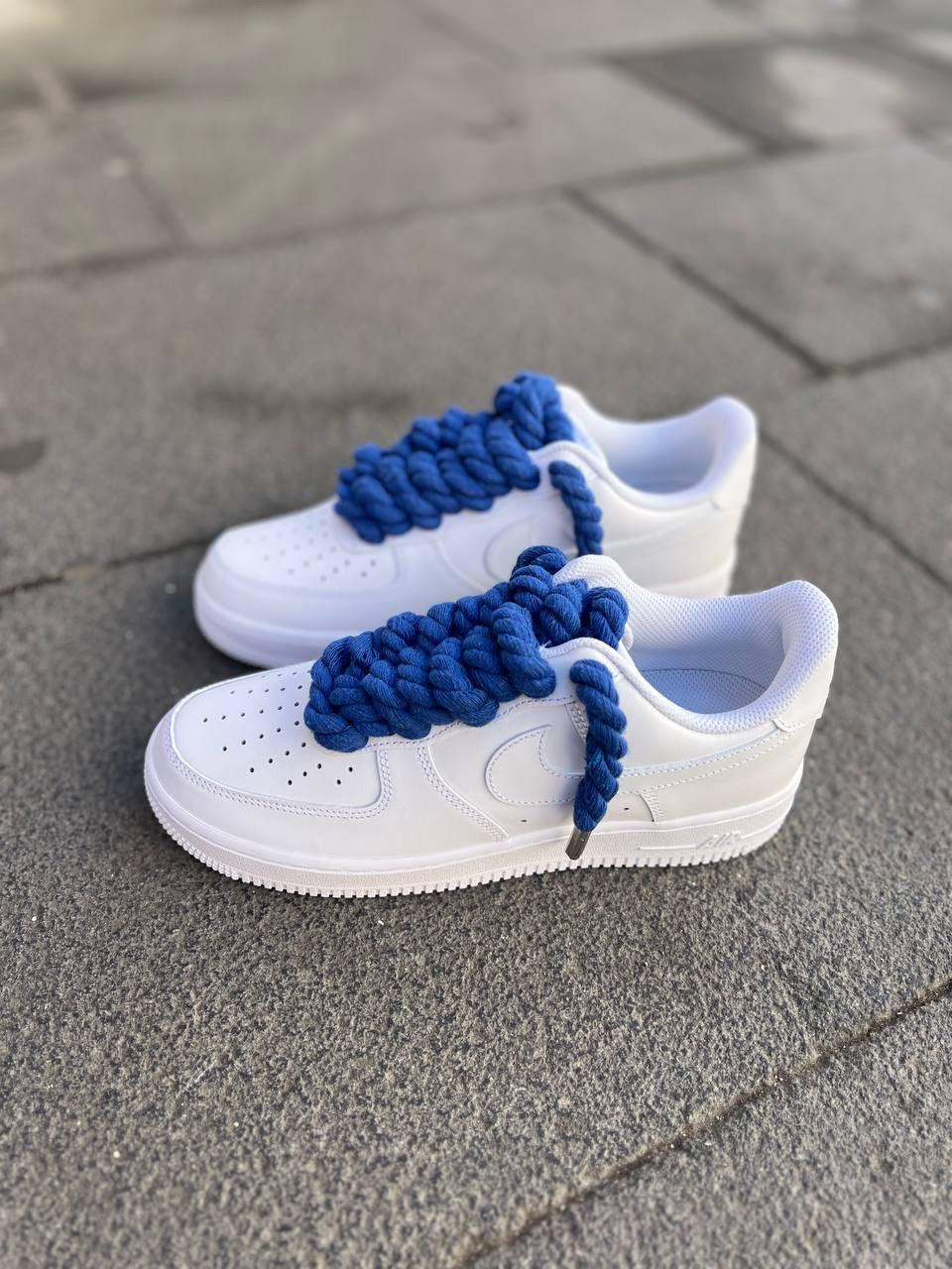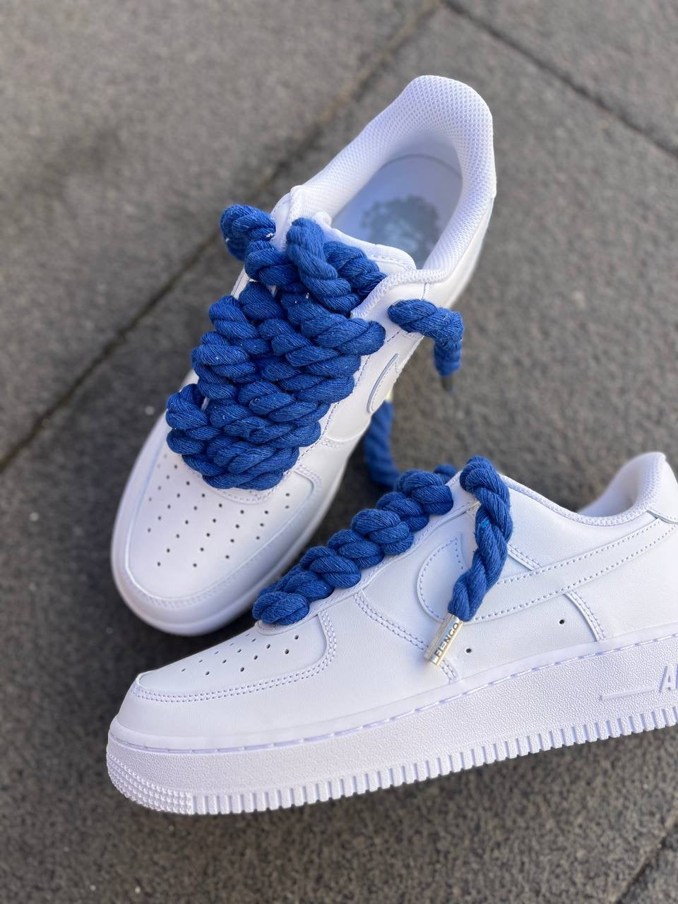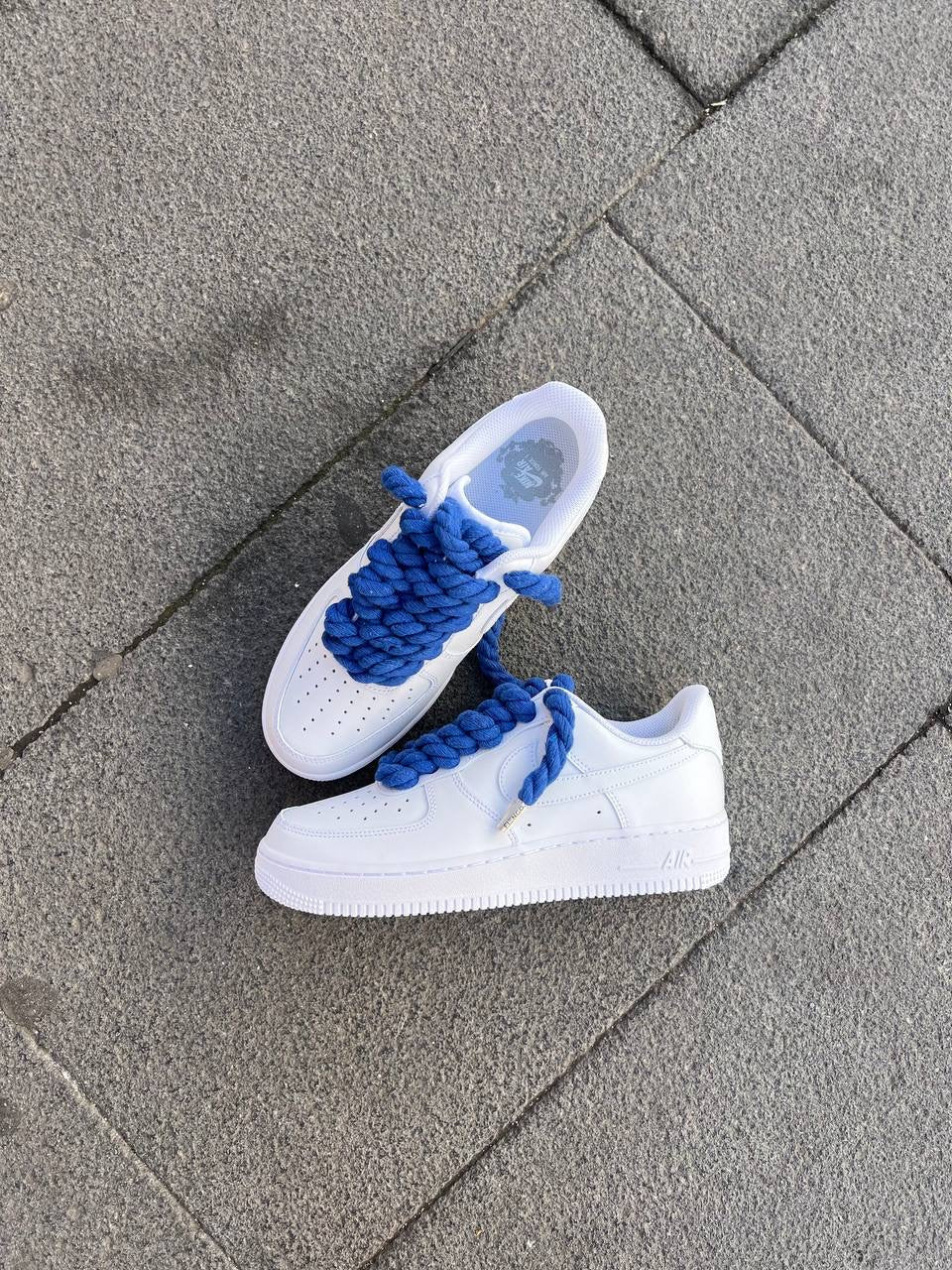Questa versione personalizzata delle iconiche Air Force 1 presenta una tomaia bianca con corde viola, che aggiungono un tocco di colore e stile unici. La suola in gomma e l'ammortizzazione Air garantiscono comfort e resistenza, perfetti per ogni occasione. Aggiungi un tocco di originalità al tuo look con queste sneaker di alta qualità.