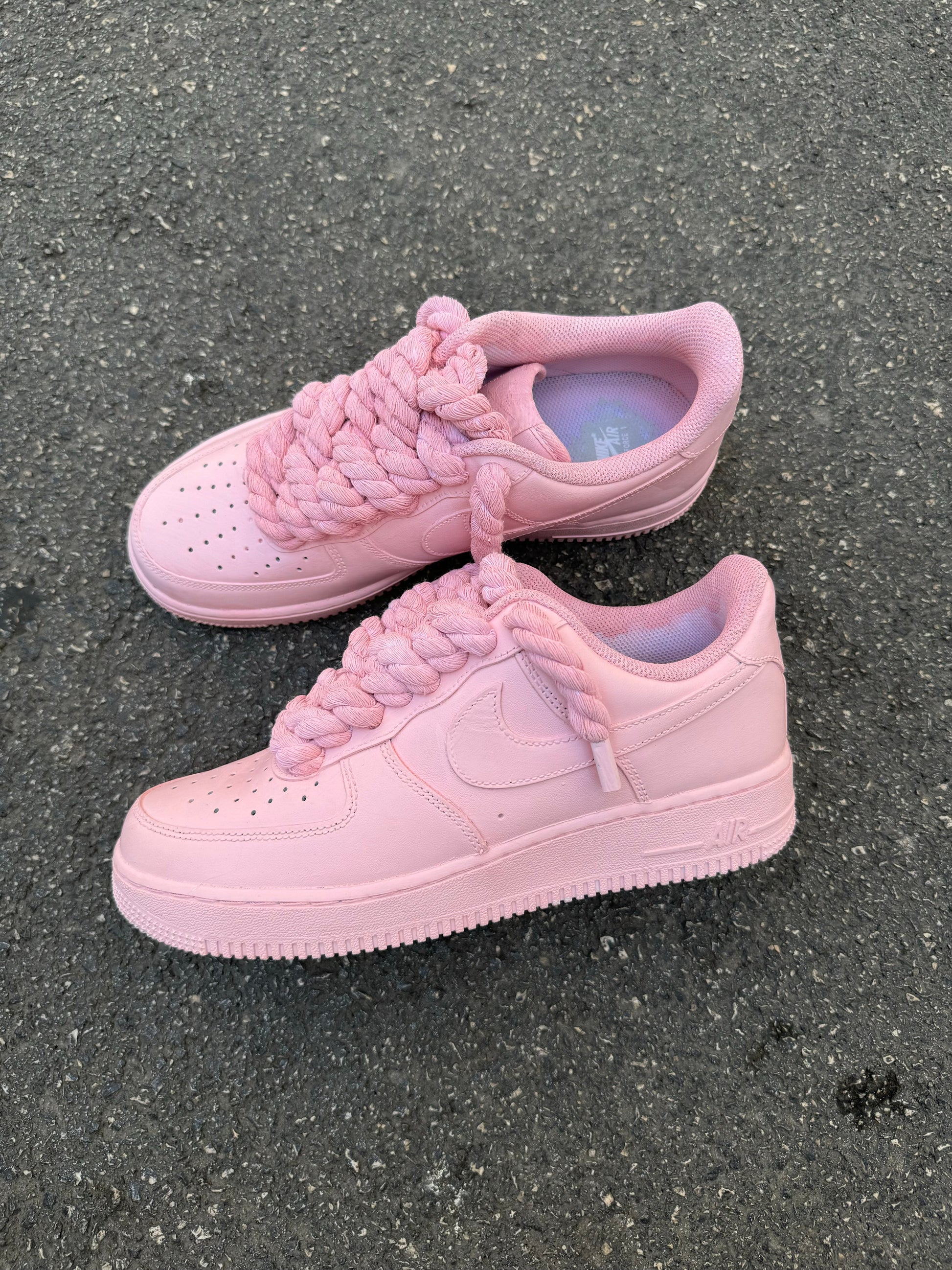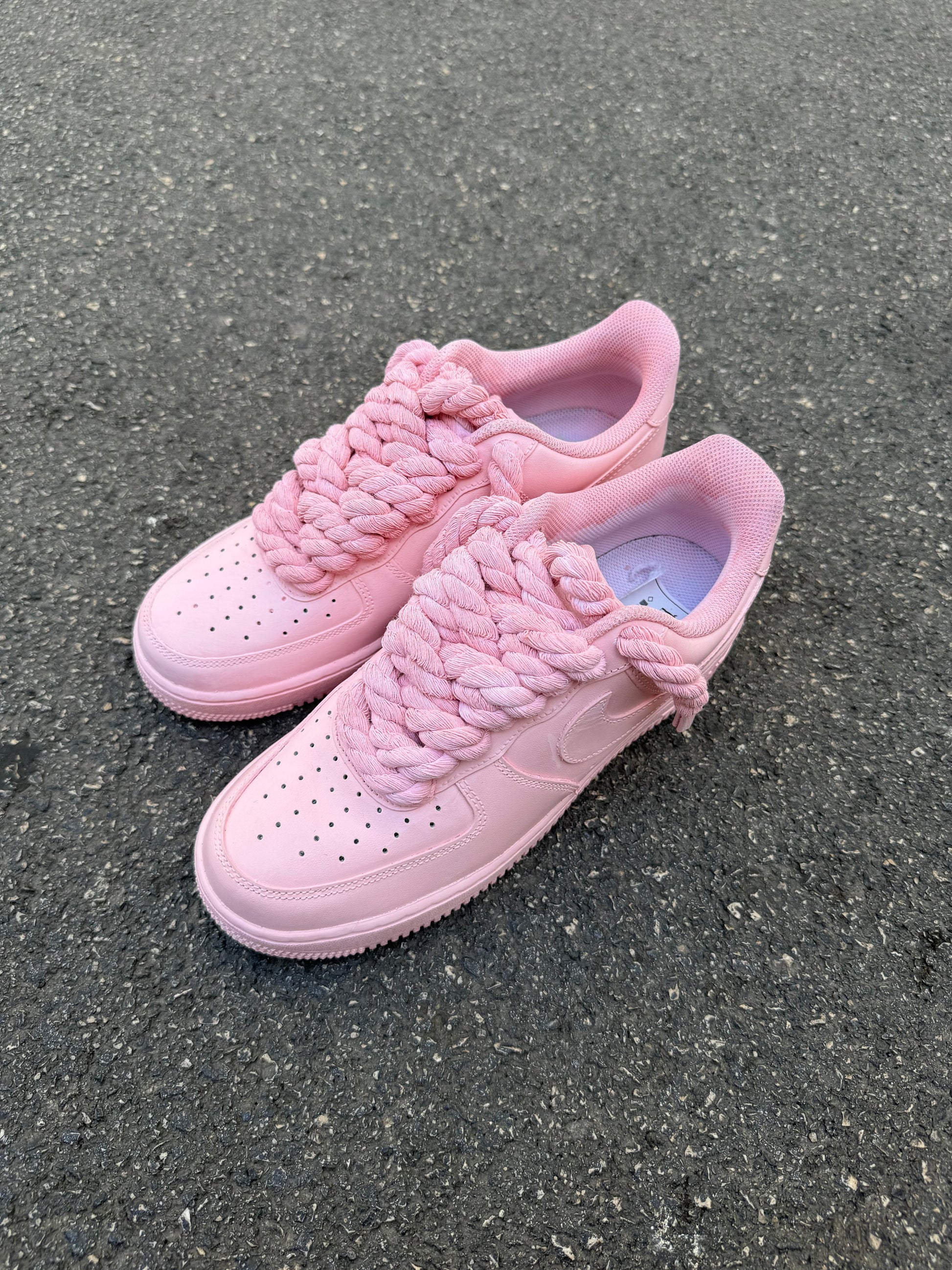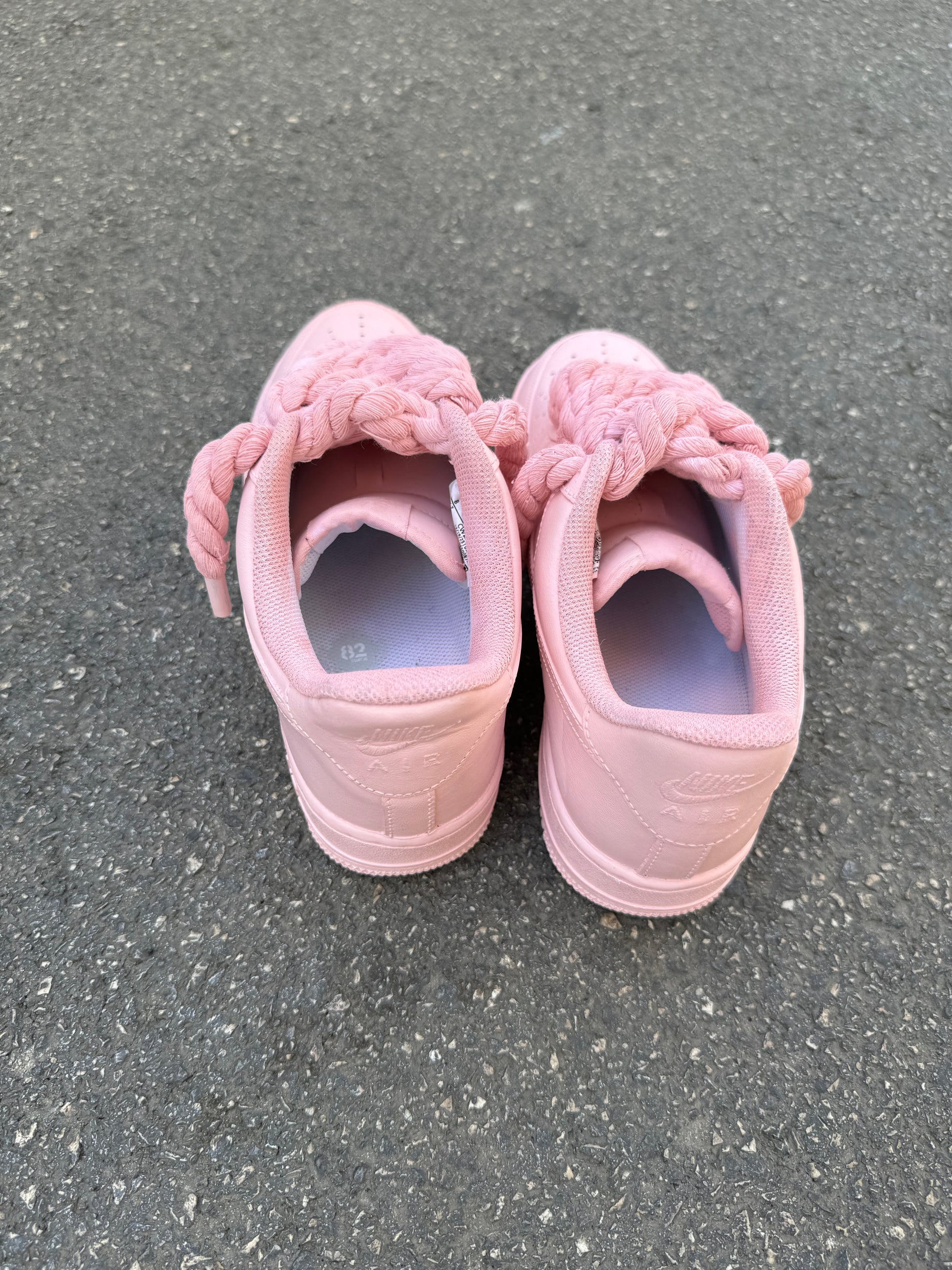 Air force 1 personalizzate con corda rosa e pitturate rosa, la pittura potrebbe graffiarsi e togliersi un po’ sulla parte della gomma perché sono molto delicate quindi vi chiediamo di prestare attenzione.