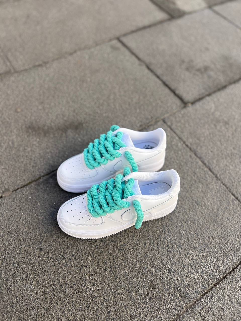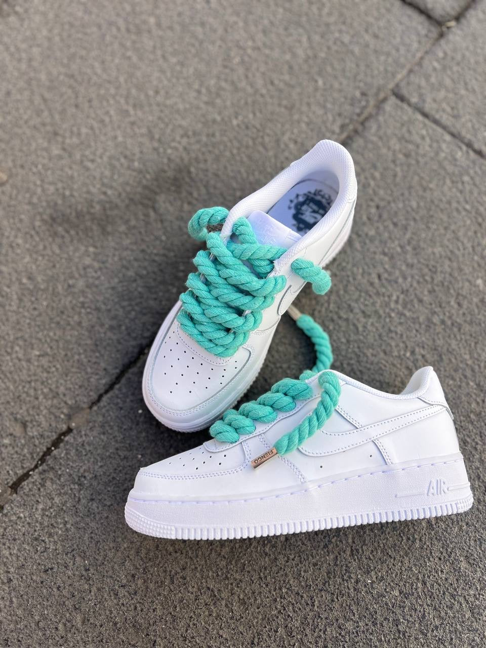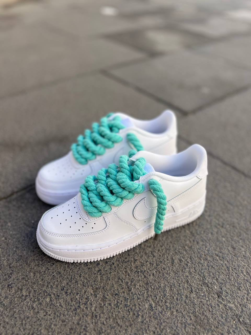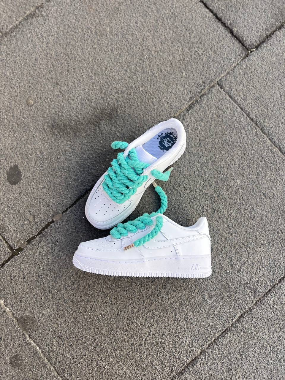 Aggiungi un tocco di freschezza al tuo look con le Air Force 1 Rope Laces Verde Acqua. Personalizzate con corde dal vivace colore verde acqua, queste sneakers sono perfette per un outfit unico e di tendenza. Goditi il massimo comfort grazie alla loro suola ammortizzata e cammina con stile con i tuoi nuovi lacci Air Force 1.